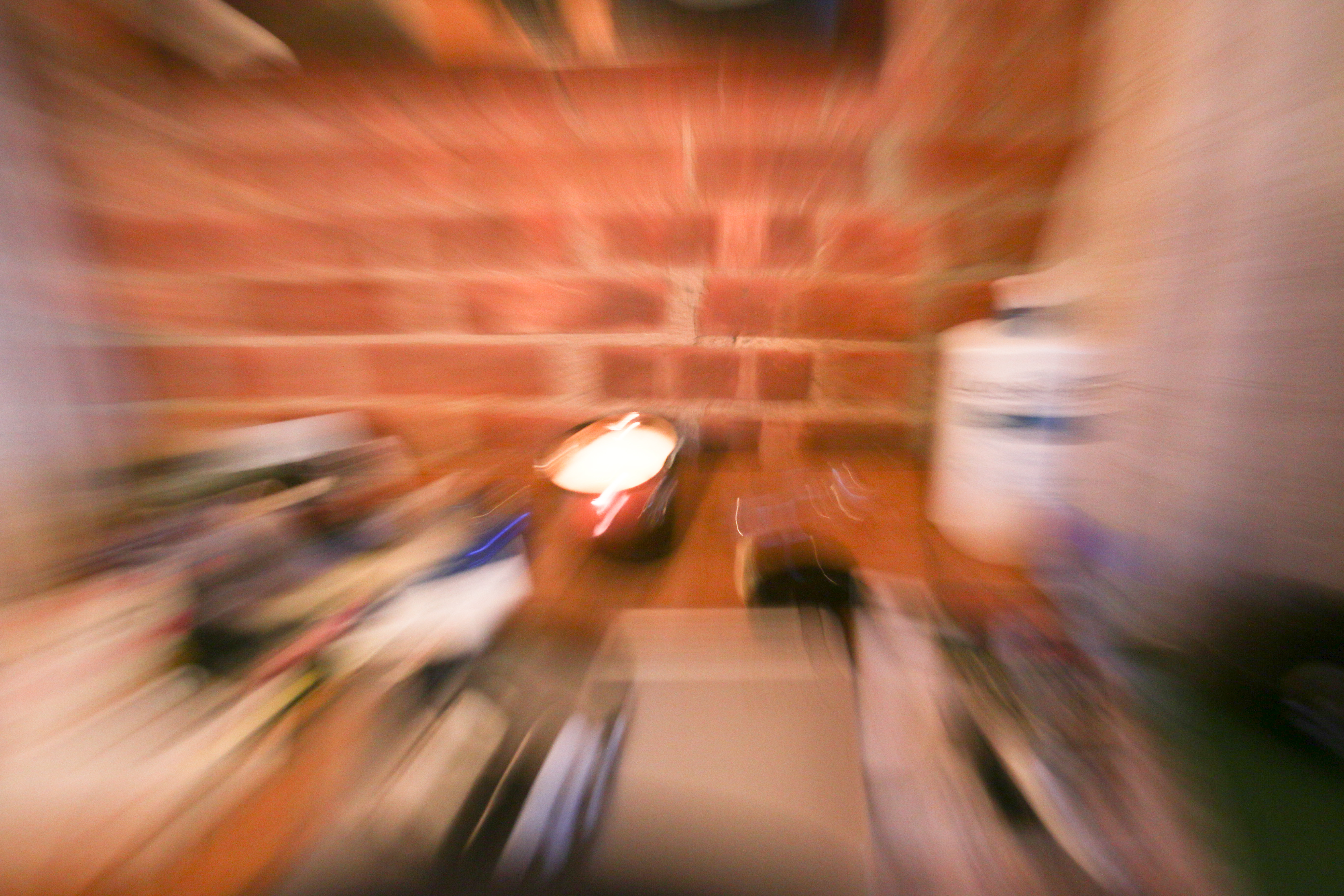 Having not practiced this technique this was my first attempt at playing around with blur. Shot at 1/10 of a sec shutter. 800 ISO. At the center of the image is a candle to the right a bottle of Lubriderm, my mouse, laptop and miscellaneous items on a table in front of brick wall.